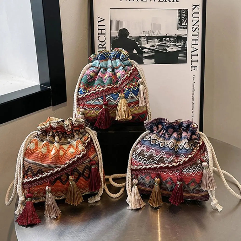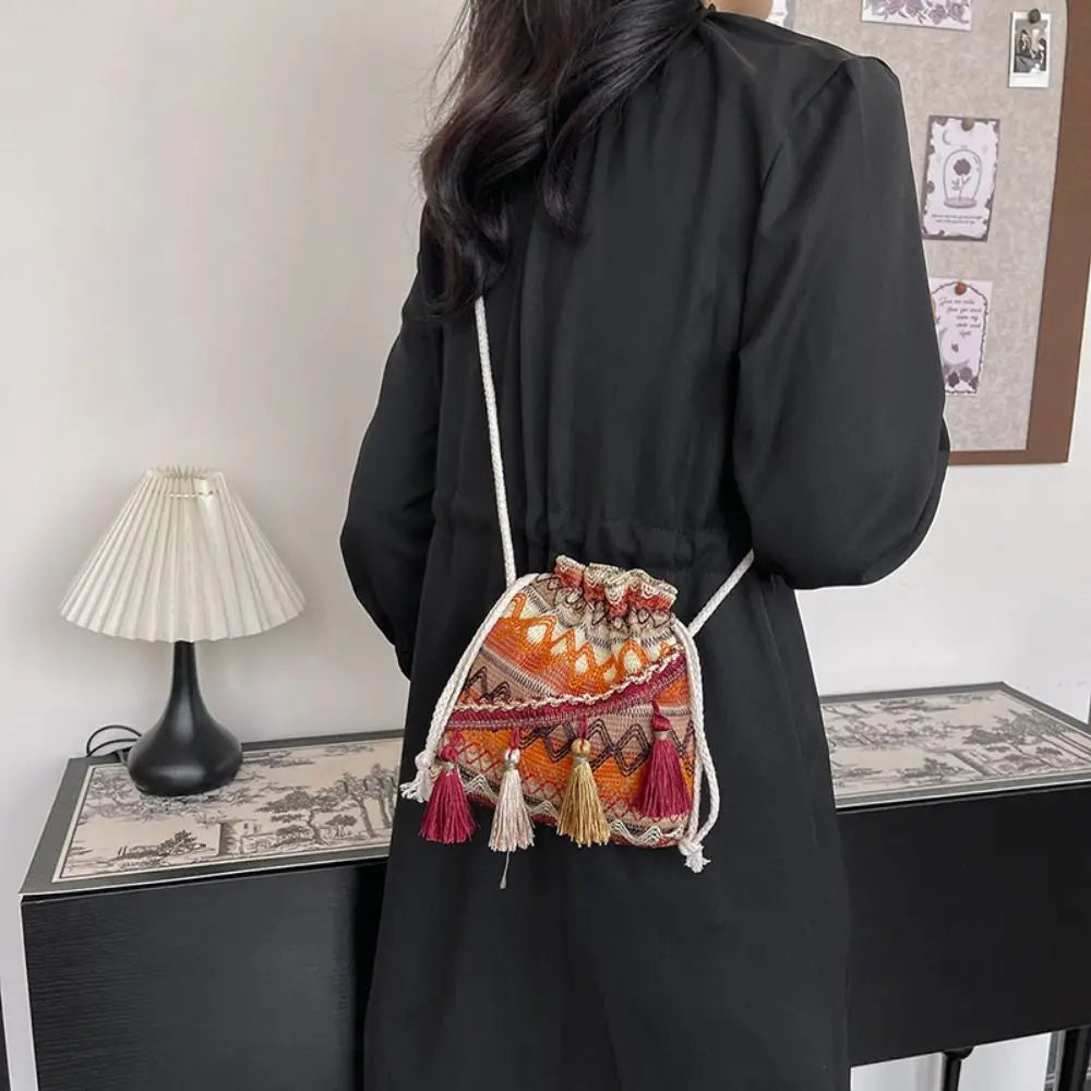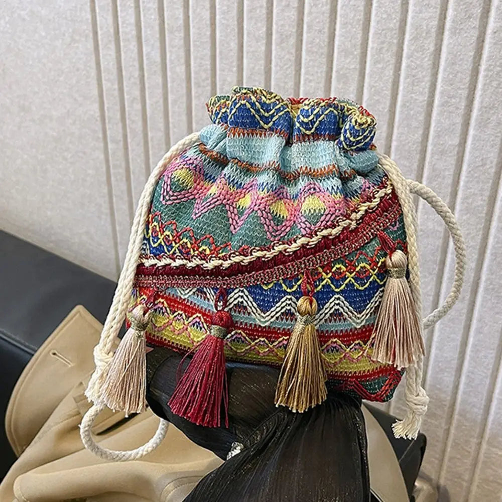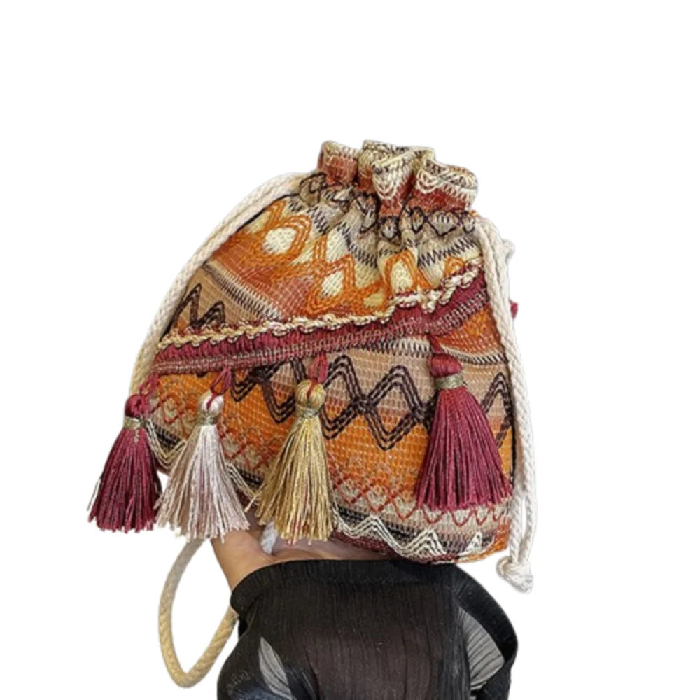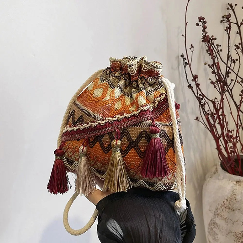 Un mix vivace di colori, frange decorative e ricami floreali dona a questa borsa a secchiello un carattere unico e giocoso. Realizzata in tessuto intrecciato con dettagli dal gusto etnico, si trasforma facilmente da borsa a spalla a tracolla grazie alla tracolla regolabile. Compatta ma funzionale, è perfetta per viaggi, passeggiate o uscite informali, regalando sempre un tocco di stile bohemien.