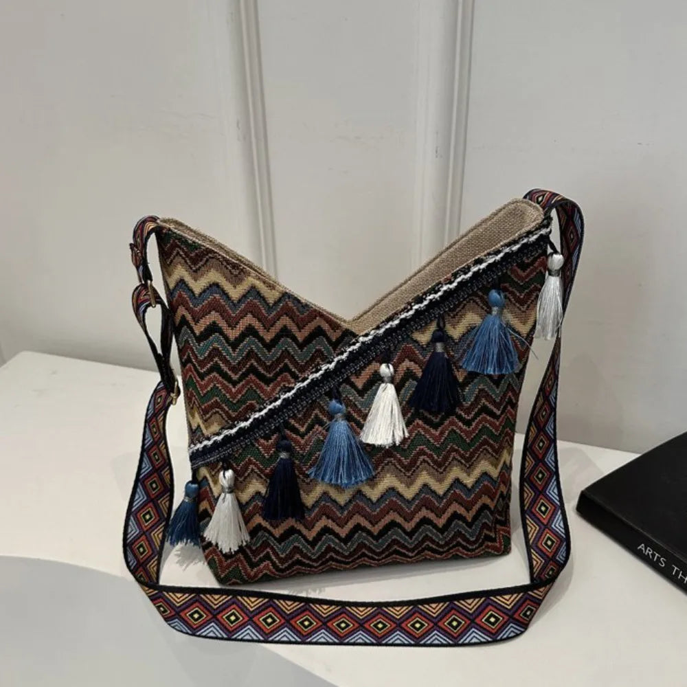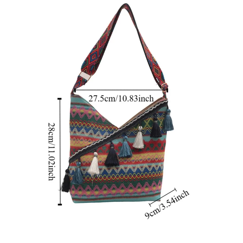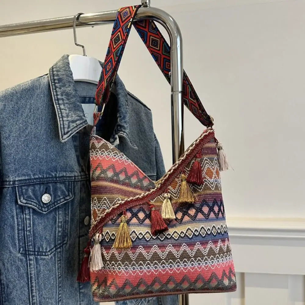 Un’elegante fusione di motivi geometrici e frange in stile bohemien, questa borsa a spalla di grande capacità coniuga fascino vintage e funzionalità moderna. La struttura morbida e spaziosa la rende perfetta per accompagnarti durante le giornate più intense, mentre i dettagli etnici donano un carattere unico e ricercato. Il manico ampio assicura una portabilità confortevole, ideale sia per un look casual che per uno stile più curato.