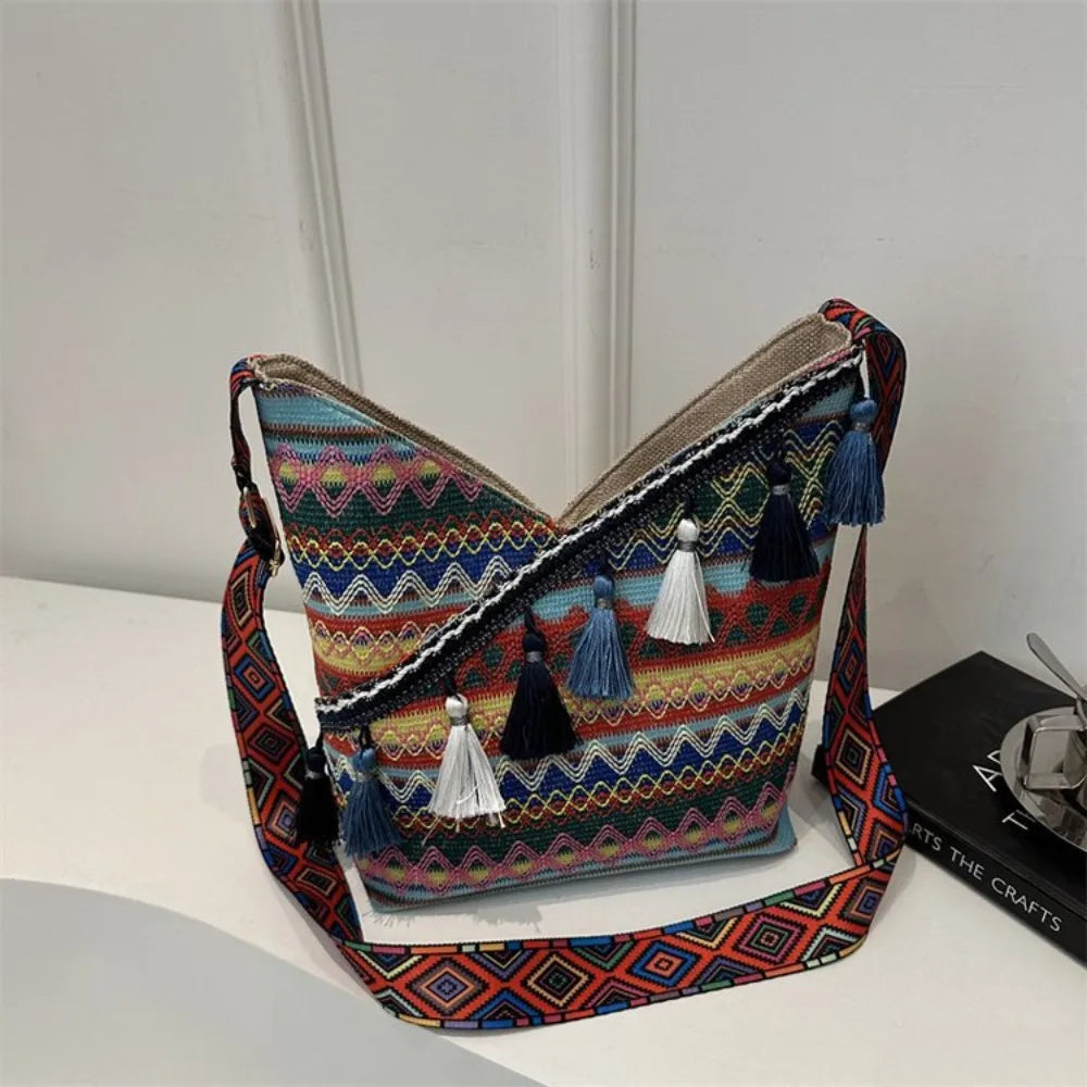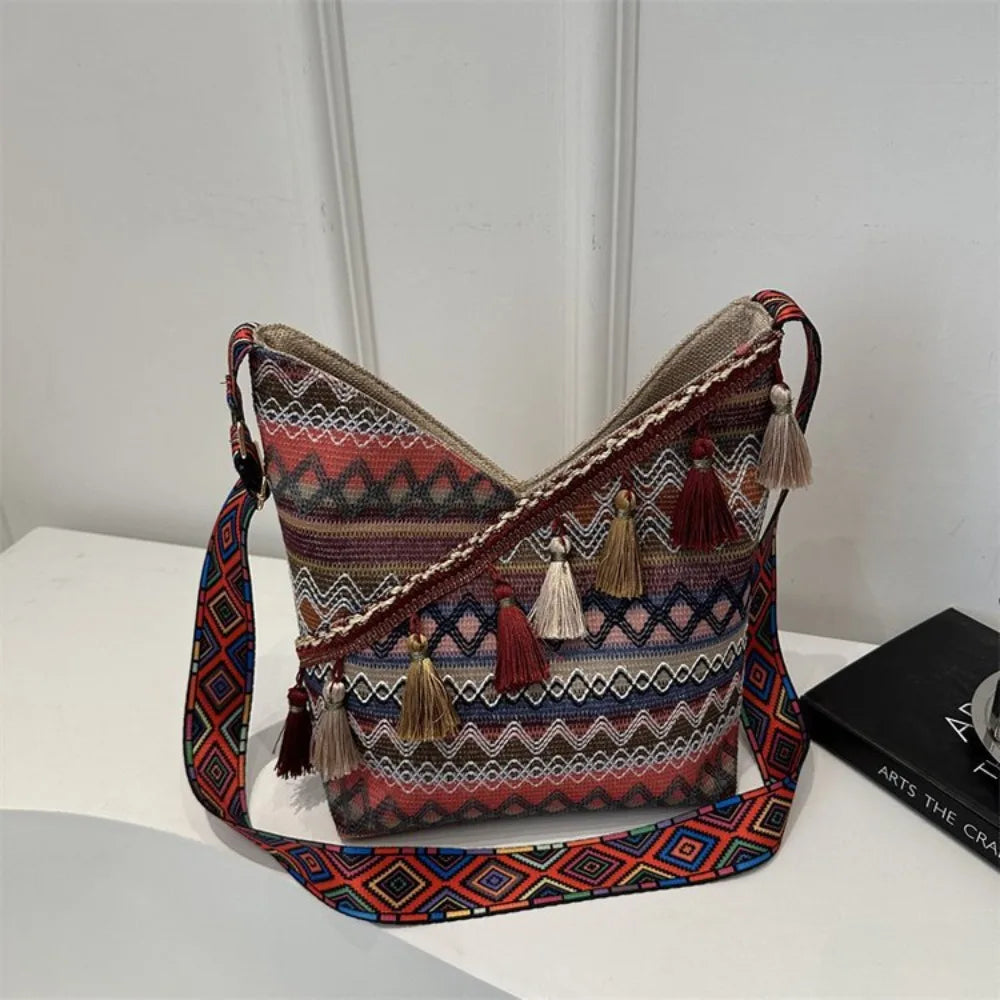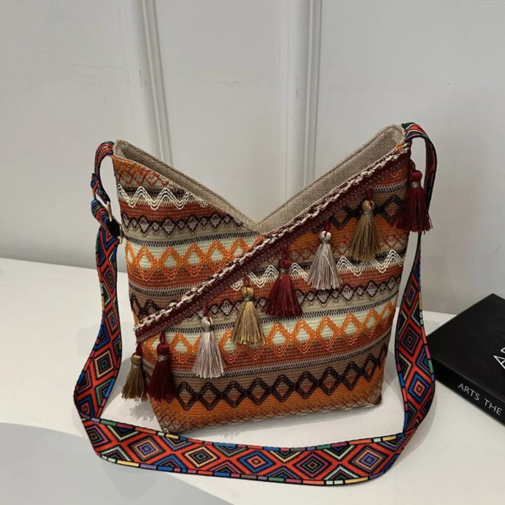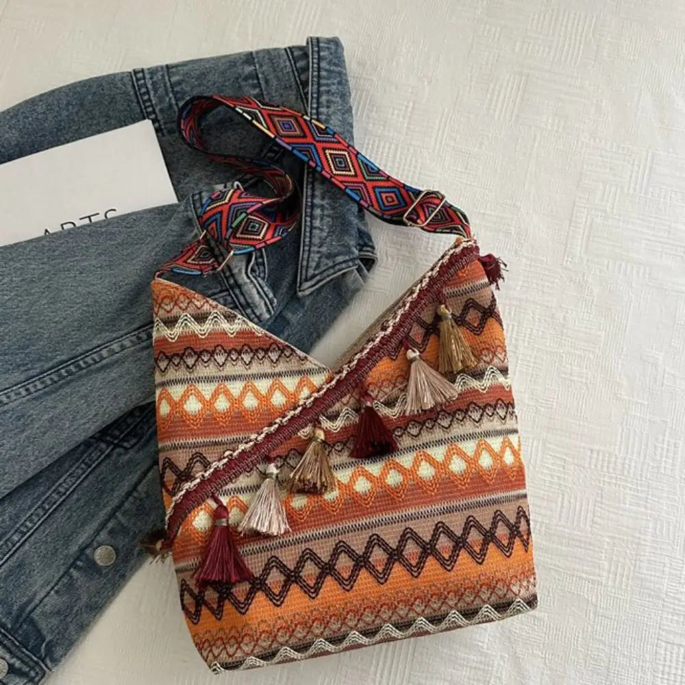 Un’elegante fusione di motivi geometrici e frange in stile bohemien, questa borsa a spalla di grande capacità coniuga fascino vintage e funzionalità moderna. La struttura morbida e spaziosa la rende perfetta per accompagnarti durante le giornate più intense, mentre i dettagli etnici donano un carattere unico e ricercato. Il manico ampio assicura una portabilità confortevole, ideale sia per un look casual che per uno stile più curato.