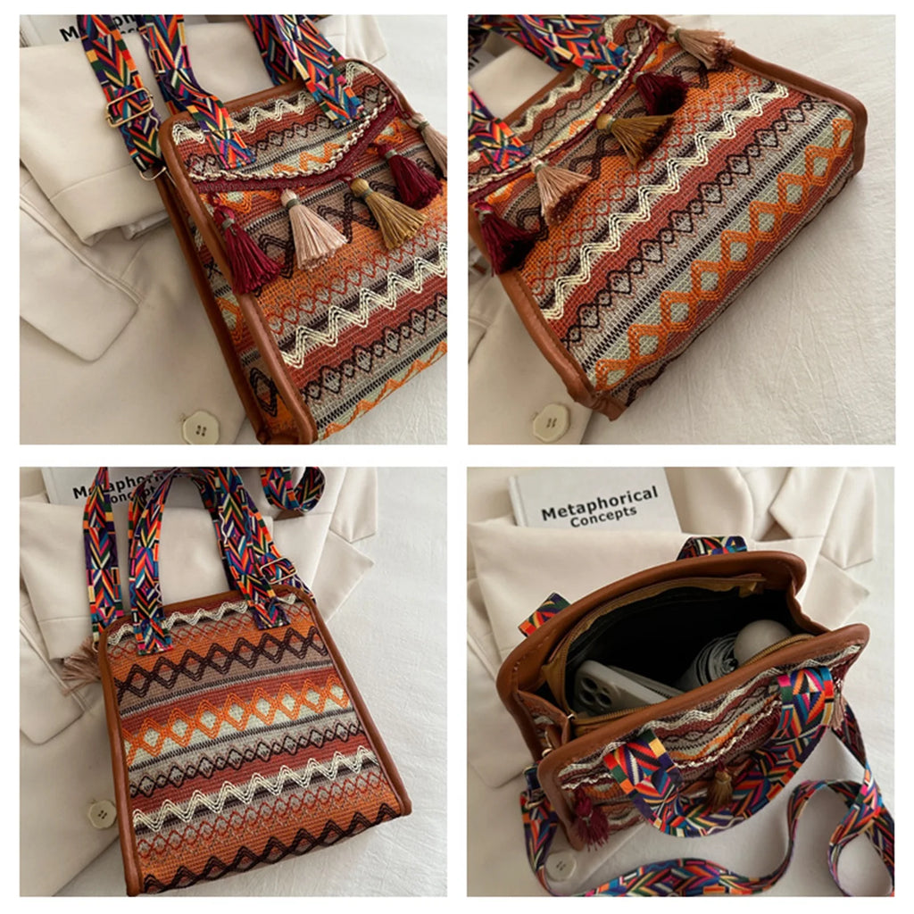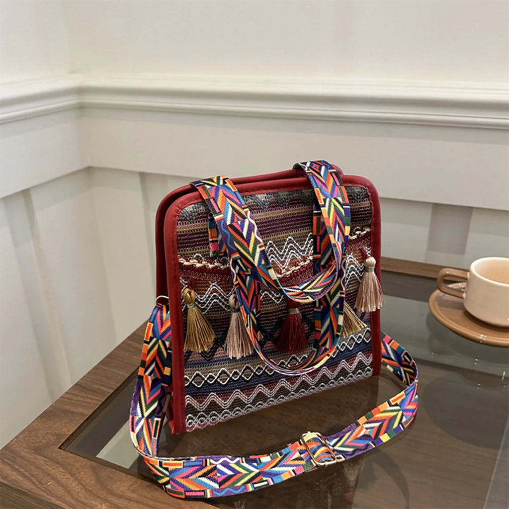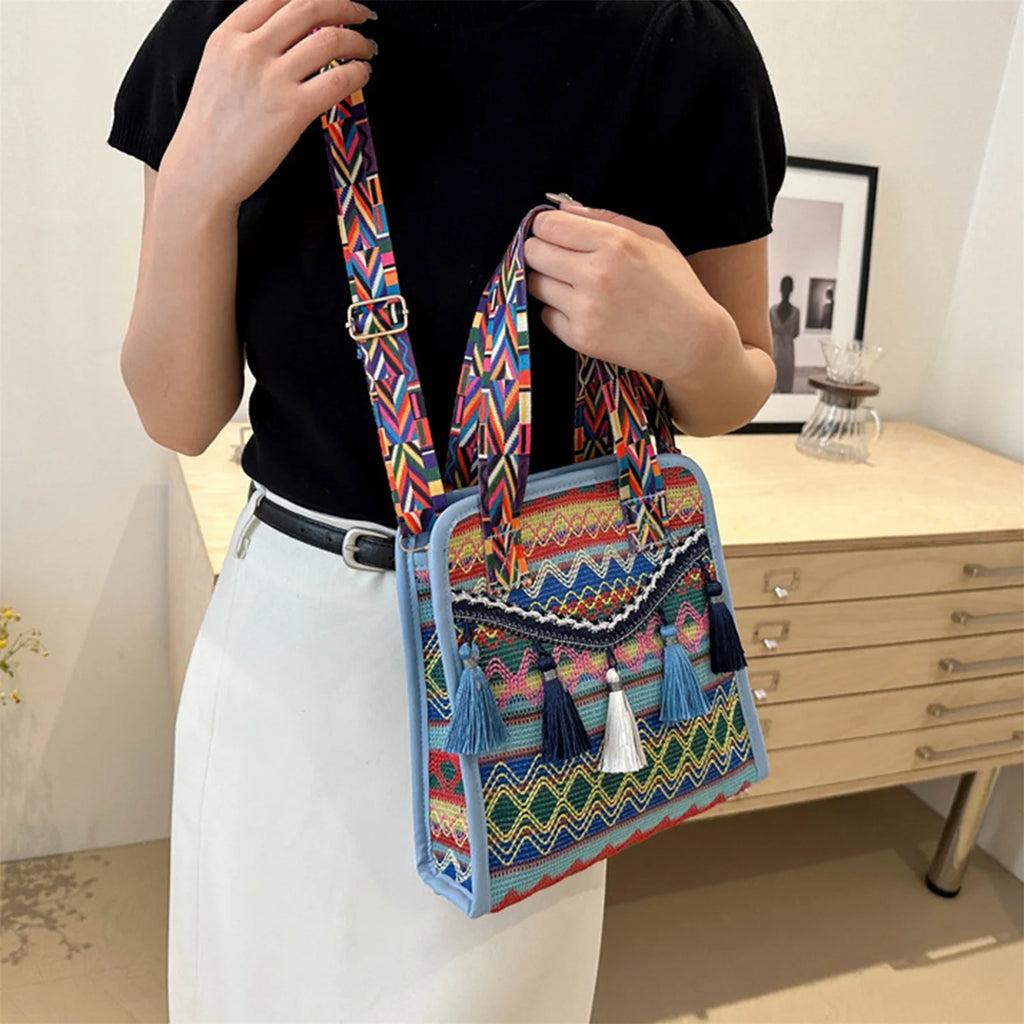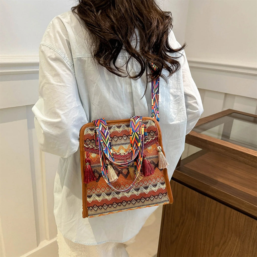 Un intreccio ricco di dettagli etnici e frange decorative rende questa borsa un accessorio dallo spirito libero e versatile. Grazie al design trasformabile, può essere indossata a spalla, a mano o a tracolla, adattandosi a ogni occasione con naturalezza. La combinazione di linee morbide e carattere bohemien la rende perfetta sia per un uso quotidiano che per completare look più particolari.