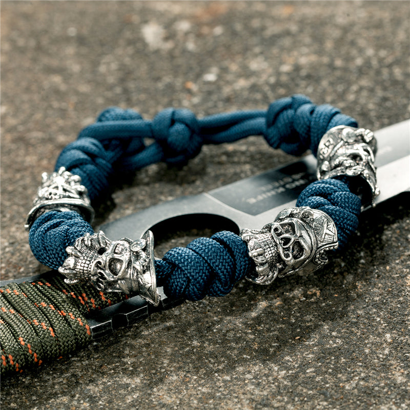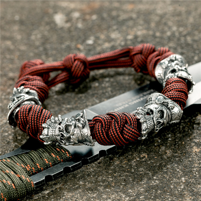 Legato dal destino, forgiato nell'oscurità, questo paracord decorato con teschi presenta teschi in lega durevole che portano il segno del mietitore. Con la sua vestibilità regolabile e i dettagli inquietanti, il Bracciale Deathgrip è un'affermazione audace di forza e potere.