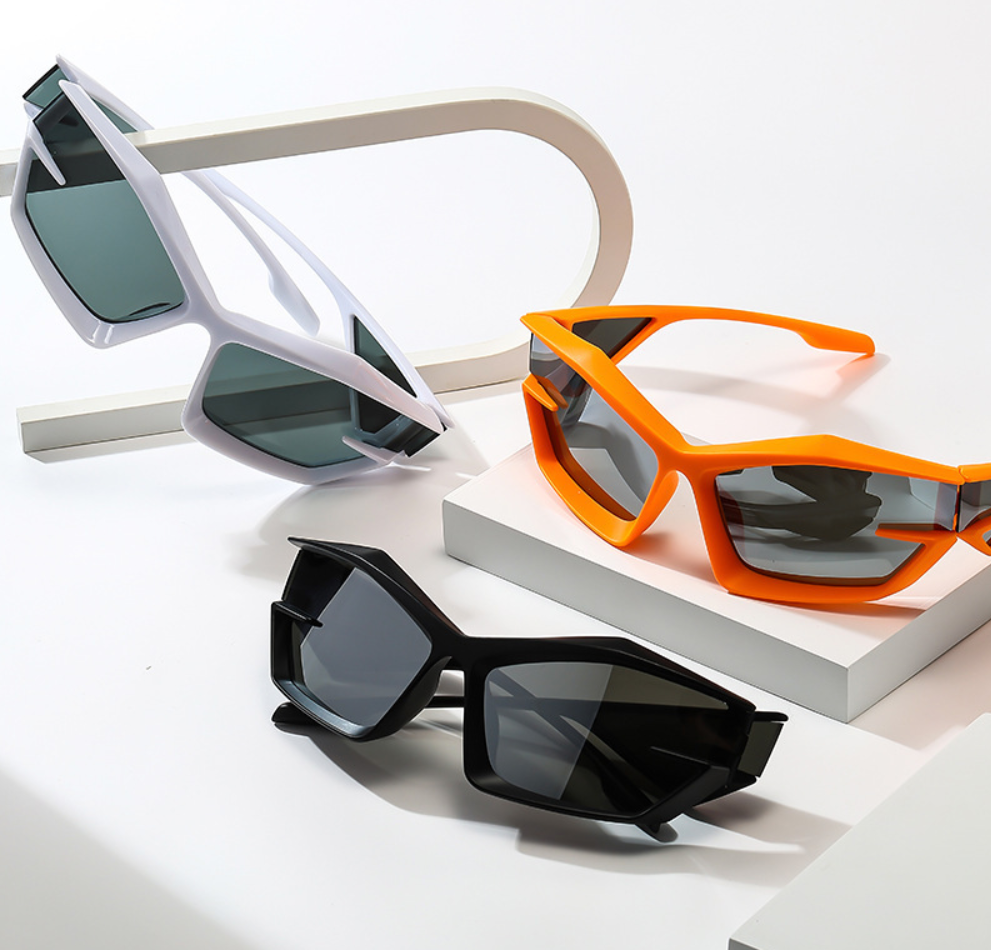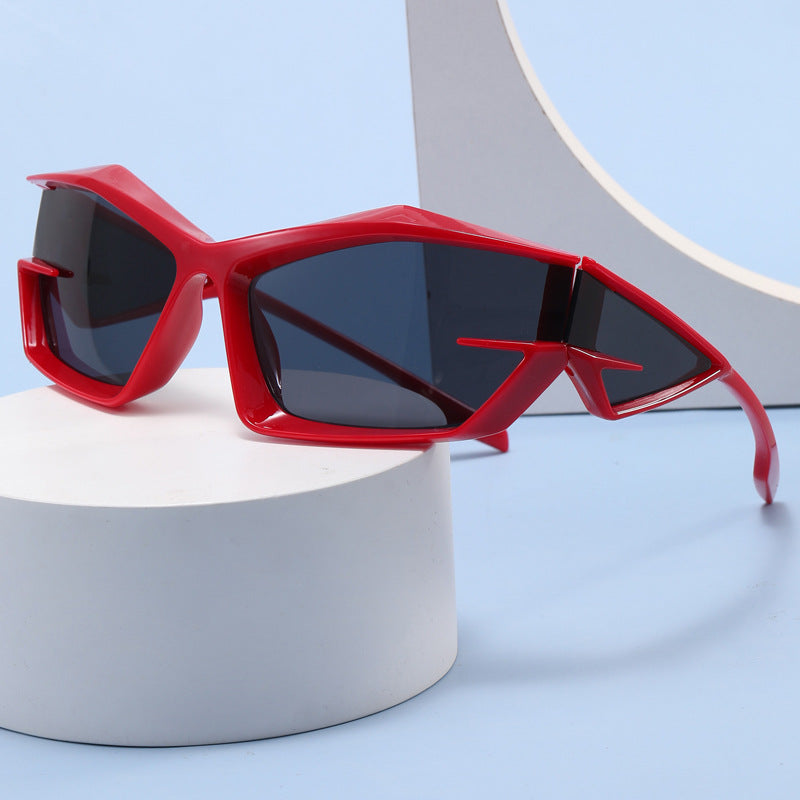Mostrando un'estetica ispirata al cyberpunk, questi occhiali sono progettati per coloro che abbracciano l'audace. Con una montatura geometrica elegante e lenti scure, emanano un'energia high-tech direttamente dal futuro.