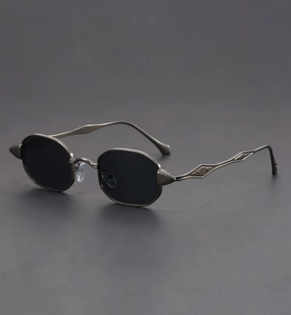 La luce del sole cattura il telaio in oro lucido degli occhiali da sole Aurelian, evidenziando ogni angolo del design leggero e resistente con un bagliore sottile che non passa mai inosservato.