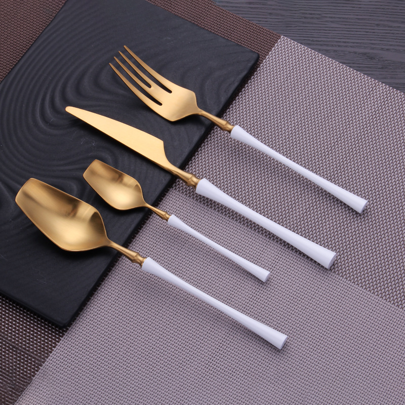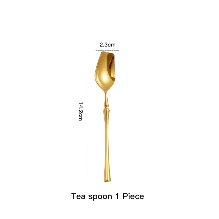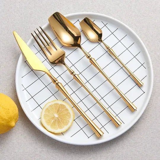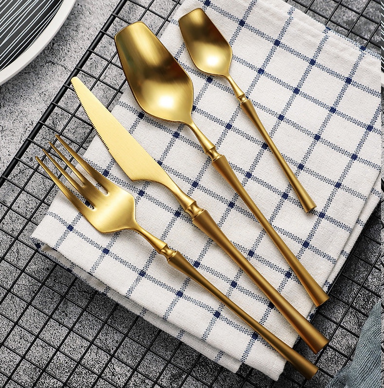 Materiale: Il set di posate Auriel in oro è realizzato in acciaio inossidabile di alta qualità e placcato in oro utilizzando la tecnologia di elettroplaccatura a vuoto con nitruro di titanio, garantendo una protezione duratura da graffi e abrasioni, rendendo le posate completamente atossiche e ipoallergeniche.